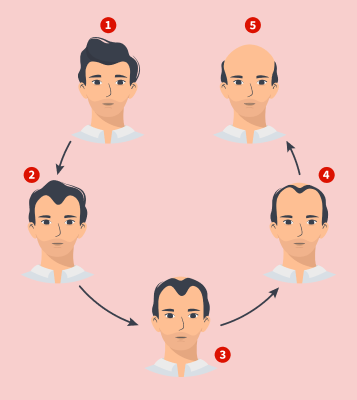 Hair loss is categorized using the Norwood Scale, which identifies various stages of baldness:
